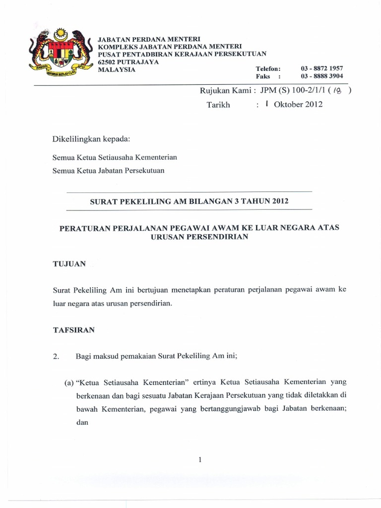 . Penulis mengharapkan adanya kebenaran berpendapat dari para pembaca yang terdiri dari unsur data opini. Permohonan lengkap perlu dikemukakan perlu disusuli dengan Ketua Jabatan penyokong masing-masing selewat-lewatnya satu 1 bulan sebelum tarikh perjalanan. Surat Pekeliling Am Bil.